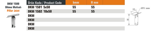 Bu sayfada Paslanmaz Çelik Dikme Mafsalı DKM - 1500 ürünümüzü bulabilirsiniz. Paslanmaz dikmeler için gerekli olan mafsal ürün resmimizi ve özelliklerini inceleyebilirsiniz.